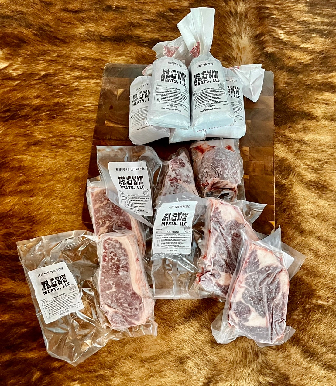 2 Ribeyes, 2 NY Strips, 1 Filet, 5 lbs Ground Beef